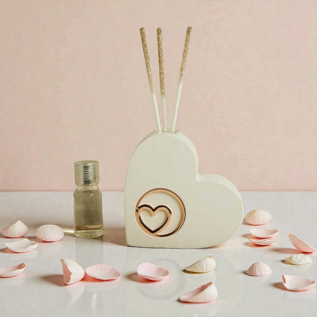 La confezione del diffusore cuore include il kit essenza, pronto per essere utilizzato. Basta versare la fragranza e inserire i bastoncini per sprigionare gradualmente un profumo delicato e avvolgente.