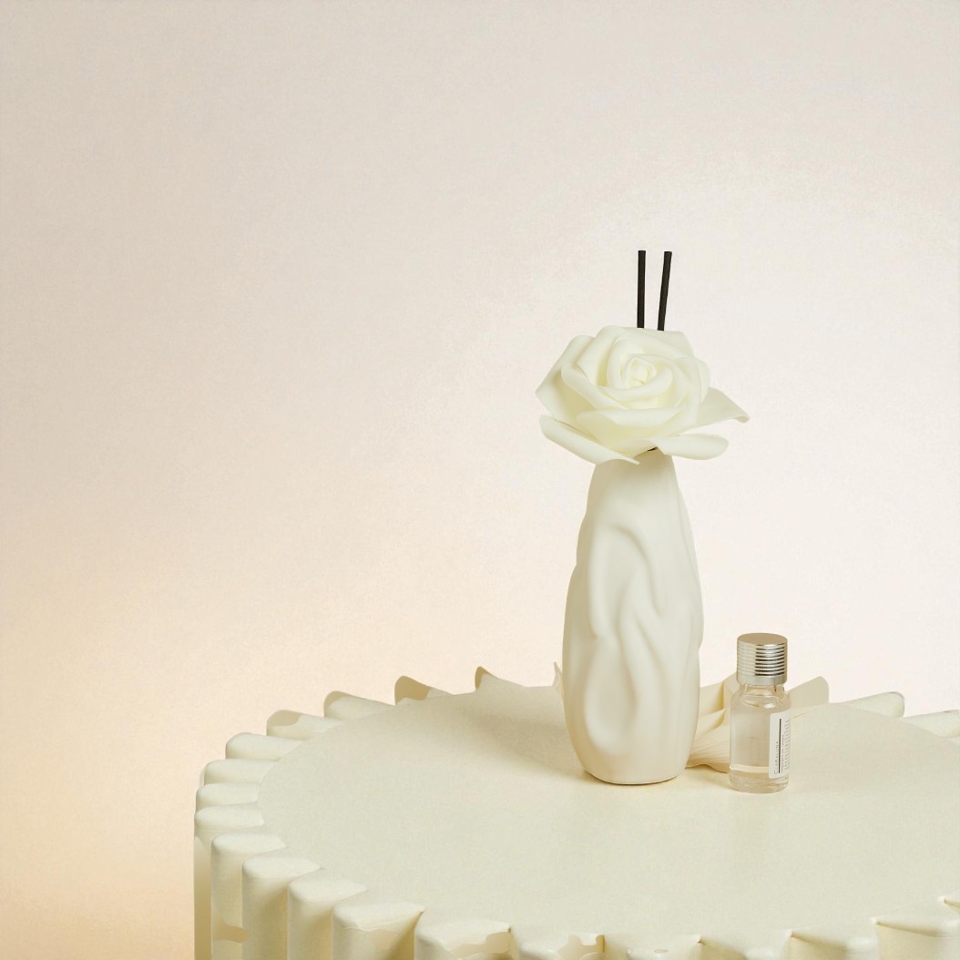 Incluso nella confezione troverai il kit di profumazione con bastoncini e fragranza, oltre a un fiore decorativo da inserire nel vaso profumato.
