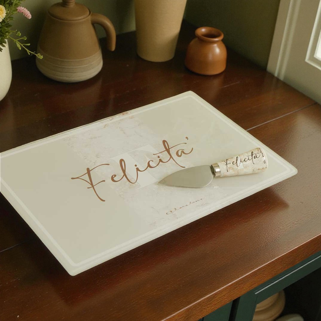 Il tagliere in vetro rettangolare con coltellino e scritta “felicità”, di Claraluna, è una bomboniera originale e raffinata, pensata per chi desidera lasciare un ricordo utile e ricco di significato.