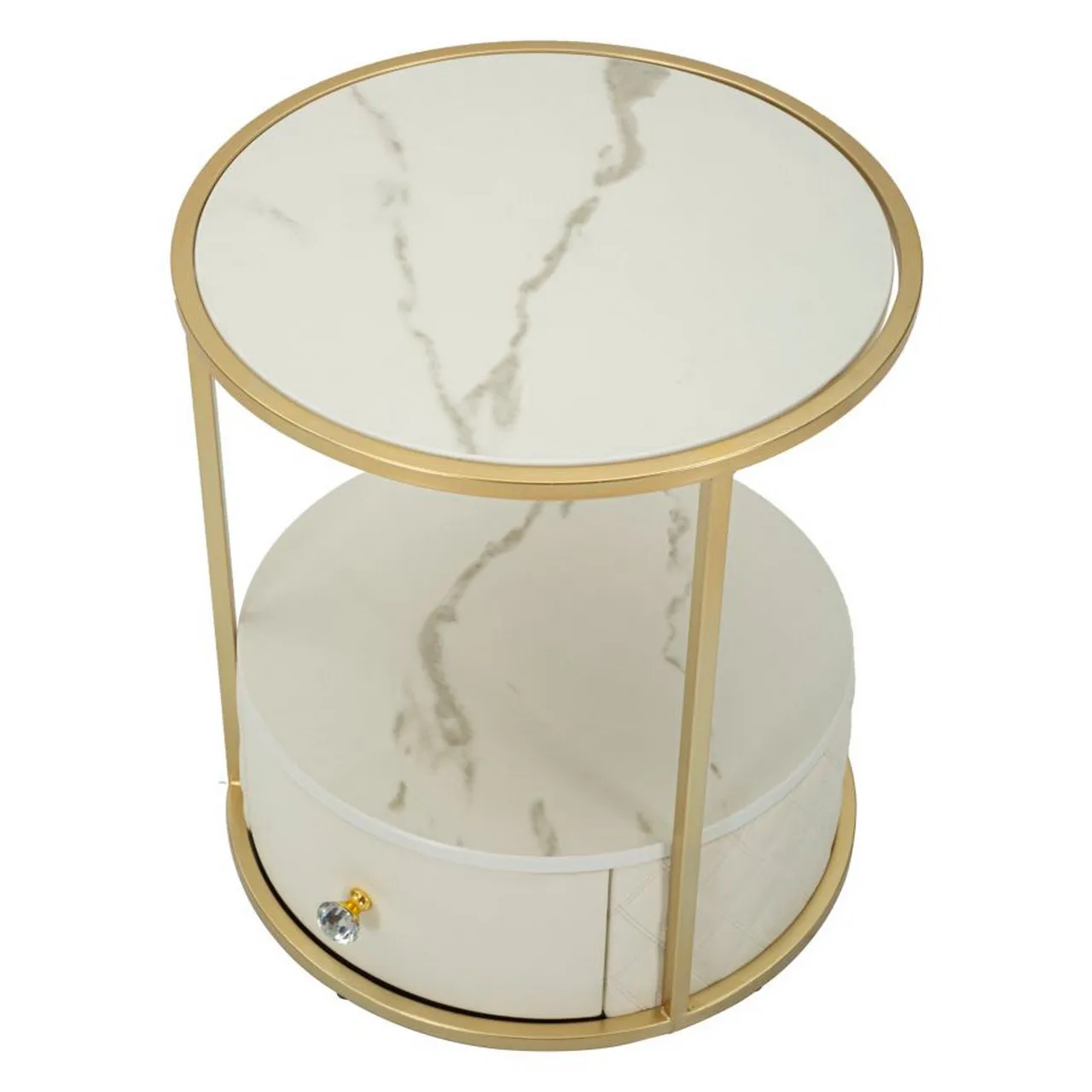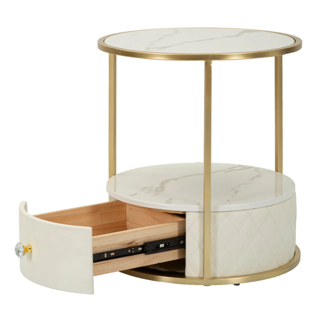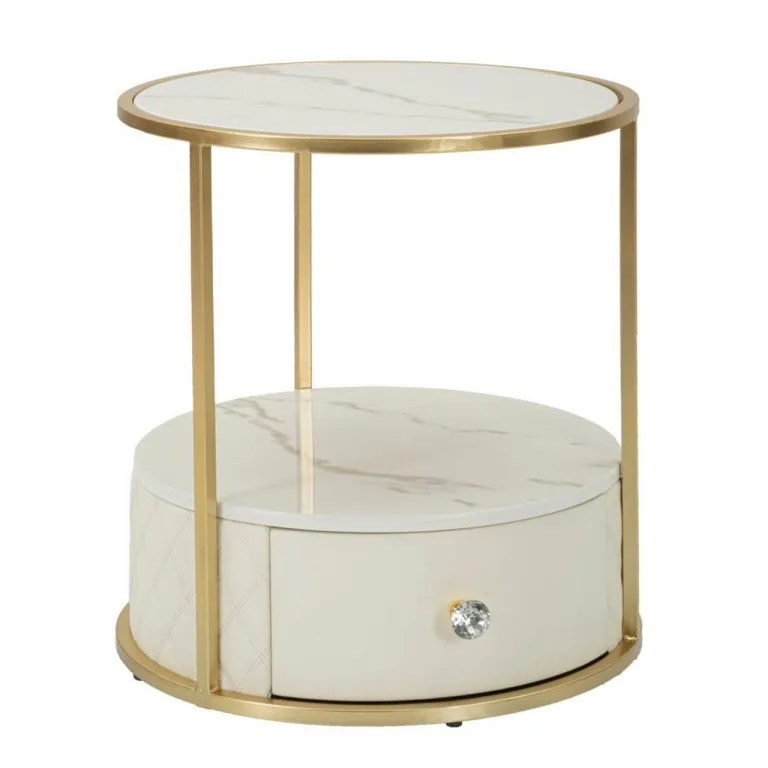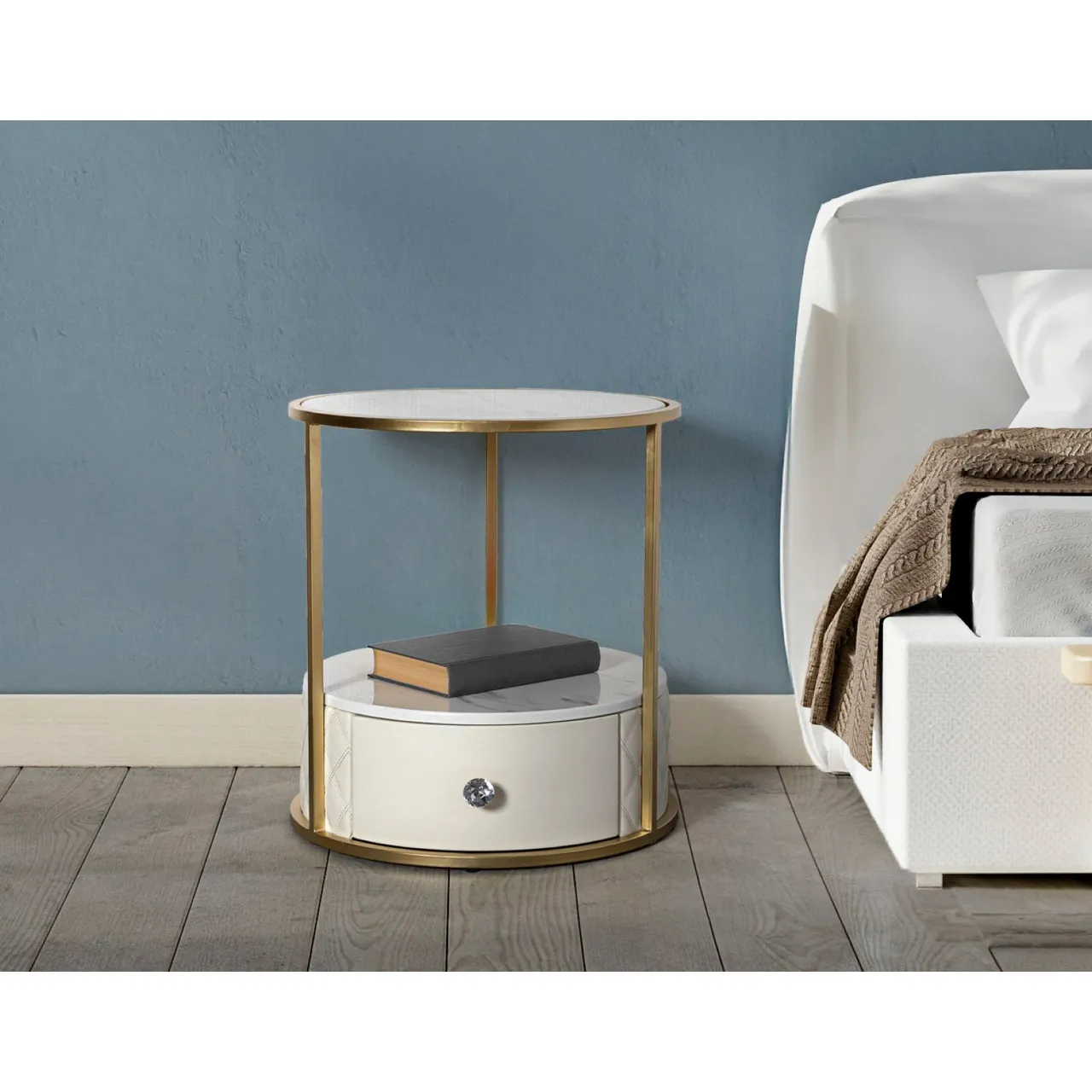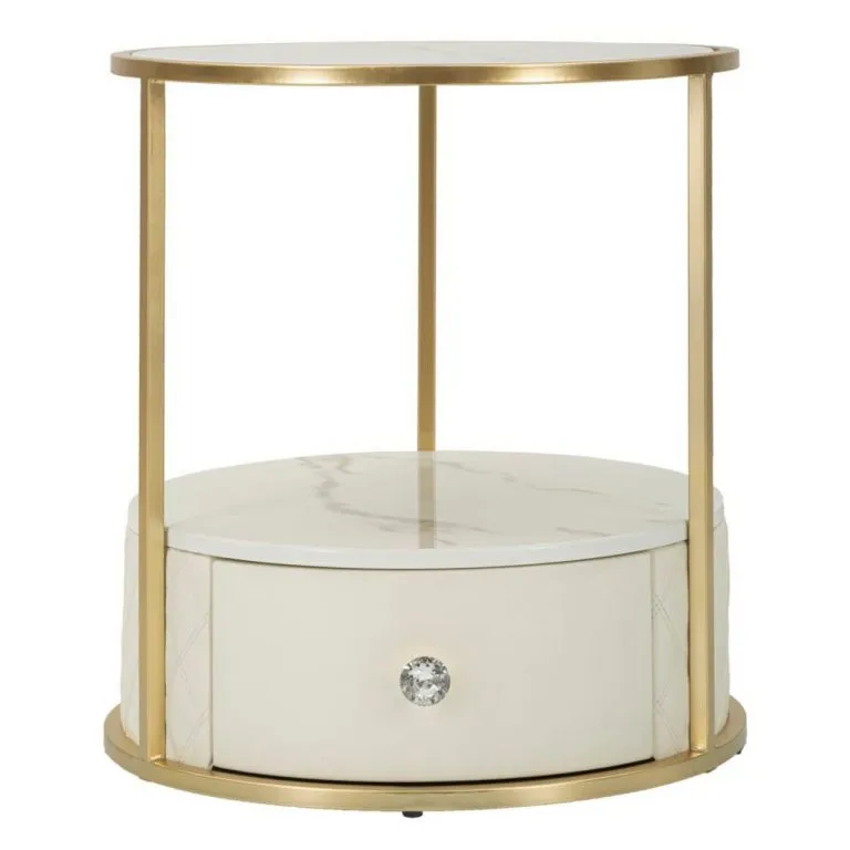 Il Comodino realizzato con una struttura in ferro che collega la base alla parte superiore, il cassetto è interamente in legno rivestito da ecopelle con pomello in strass, successivamente troviamo i top in simil marmo.
