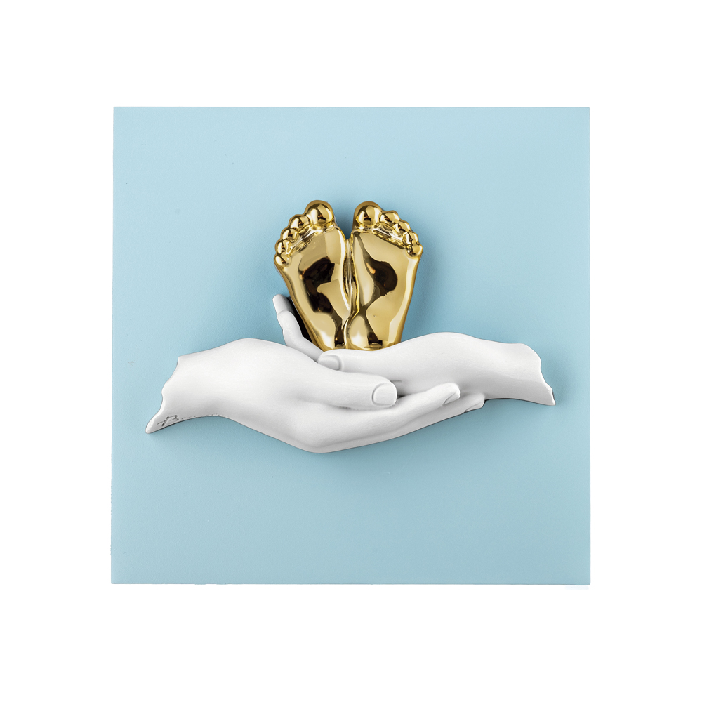 Cattura l’emozione pura della nascita con il raffinato Quadretto Celeste Sacra Famiglia Piedini della collezione Bongelli Preziosi.